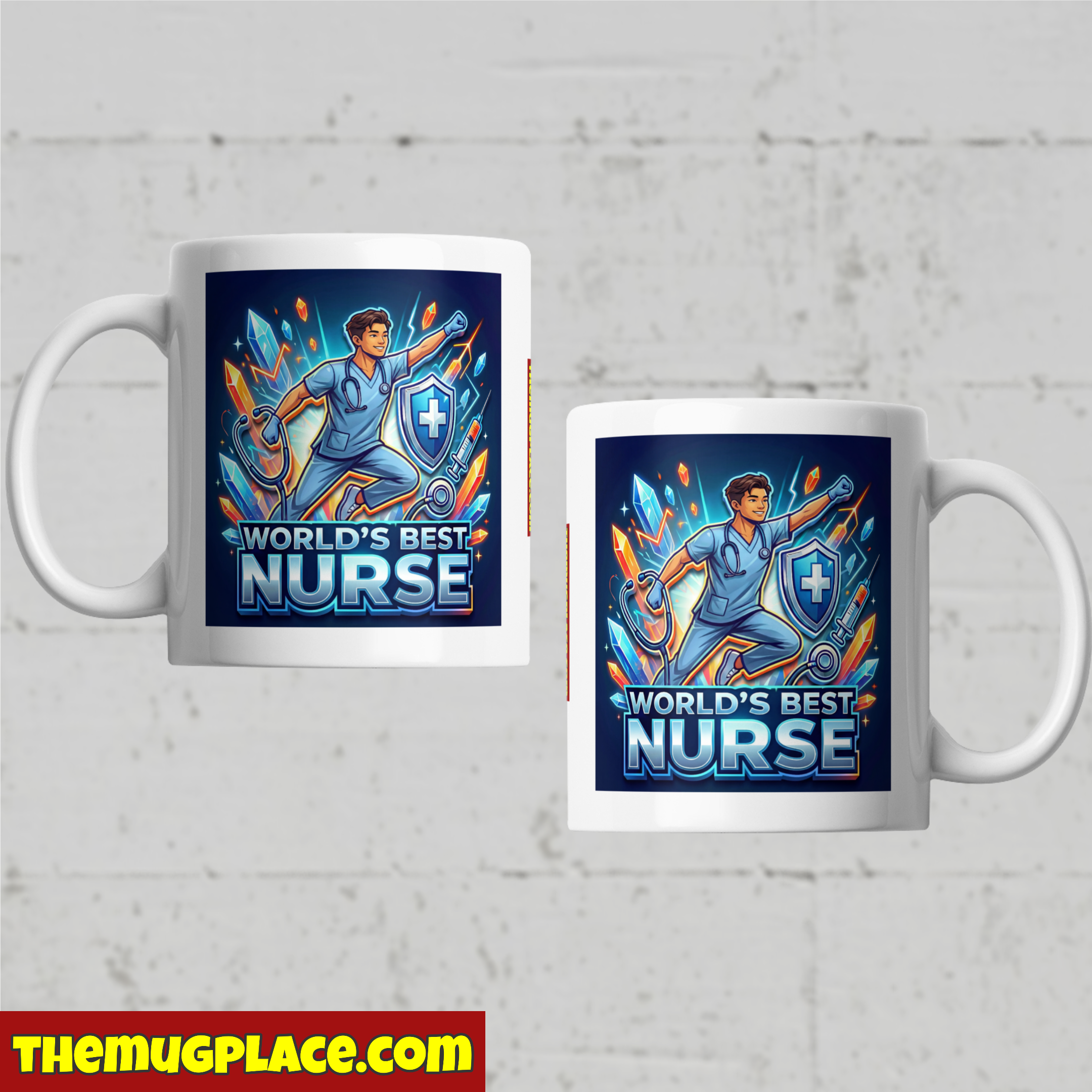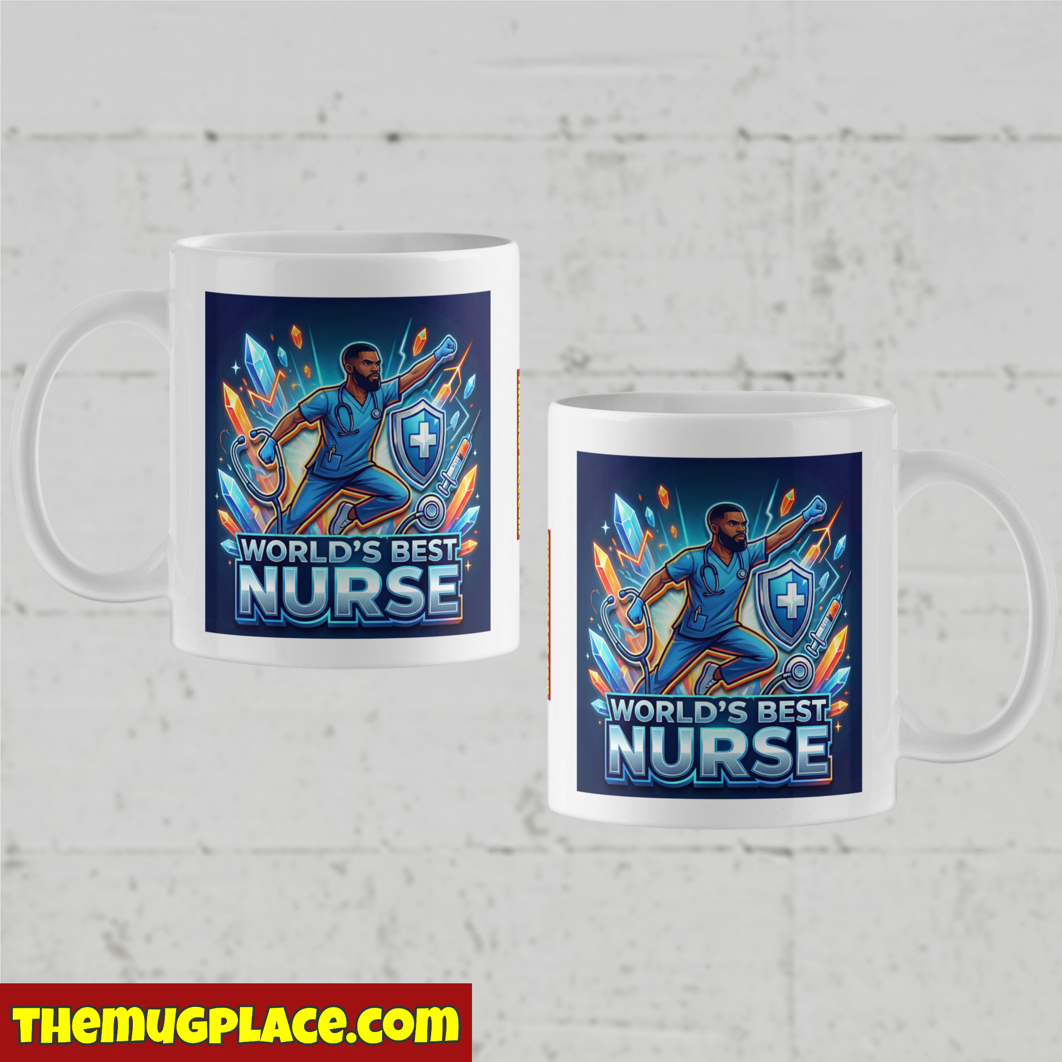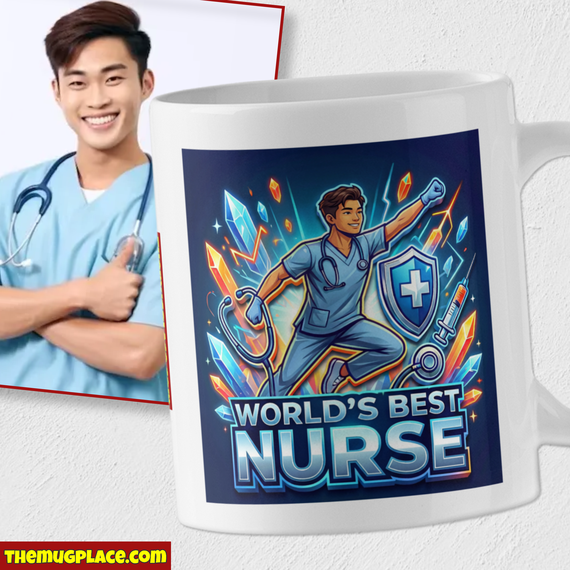 The custom design features bold, vibrant artwork with him striking a commanding pose, surrounded by symbolic elements of healthcare heroism—stethoscopes, medical shields, syringes transformed into instruments of hope. The “World’s Best Nurse” text glows with the kind of authority that matches what he actually brings to every shift. No apologies. No understating it. Just pure acknowledgment that he earned this title through skill, determination, and showing up when it mattered most.